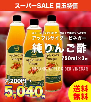 ご案内 全国一律 送料無料 商品名/容量 アップルサイダービネガー(純りんご酢)750ml×3本 特徴 ●750ml(大さじ1杯で約50回分) ●お飲物としてお飲みになる場合は、必ず5倍以上の水または炭酸水やりんごジュース等で希釈してお飲みください。